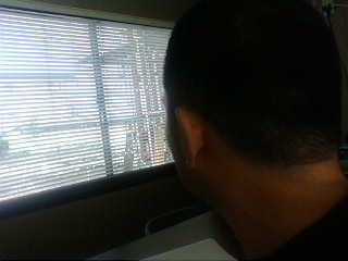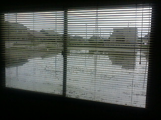 ブラインド越しに見える外には田植え間近の田んぼが見えます。
