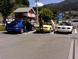 で、この写真の3台はインプ:まー家 BMW:Nさん ロードスター:Hさんという事で、みんな元走り屋ばかりなので山道&ワインディングロード大好き人間で計画した道も当然のごとく「走れる」道です。