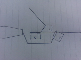 製作している中で気になったのが写真の寸法なんですが、錘のアイ(a部分)と天秤のへの字折り曲げ(b部分)・折り返し(c部分)の寸関係で、b・cの寸法はaよりも大きくしてください。