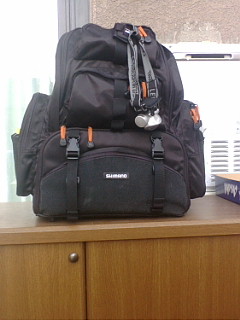 シマノのシステムバックLです。以前使っていたバックは収納能力は優れていましたが持ち運びが大変でした(ちなみにシ○さんとこにハーゲンダッツと物々交換しました)これさえあれば、たとえ男磯であろうと、水の中であろうと、砂浜行軍しようと問題ありません!!ちなみにリールは5個収納できるらしいですが、そんなにもありませんので交換用スプールがしまってあります。