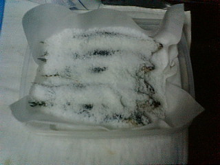 また、先ほどと同じようにクッキングペーパーを敷き、塩・イワシ・塩と並べていきます。