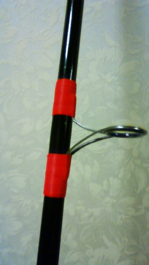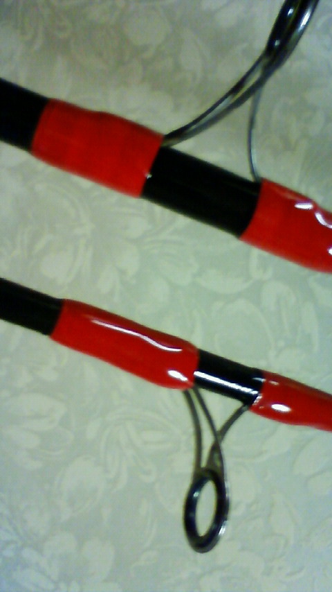 で、いよいよスレッドを巻く段階になったわけですが、スレッドを何色にする?って話でコロカラーとか玉虫カラーとかいろいろ案は出たのですが、最終的には赤か黒で竿が黒なのでがま〇つ風に赤にしようって事になりました。ちなみにメタリックの方が目立つからカッコエエかも・・・・なんて事でしたが某剛竿ビルダーさんが調べてくれてスレッドの強度はメタ無しの方が良いらしいとの事でメタ無しの赤にしました。