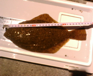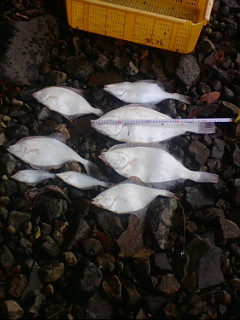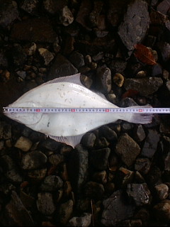 とりあえずこれで顔を見たと喜んでいると、今度は真ん中なの竿に先ほどより大き目の当たりがあり、糸ふけ→ドラグ音。あげると31・2cmほどのイシカレイが上がってきました。これでカレイも自己新更新です。