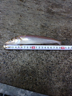 空が明るくなり始めいよいよ引き釣り開始!とりゃ~~~~と第1投を5色付近に落としサビきます・・・・サビキマス・・・・あれ??第2投ゆっくり時間をかけさびきます。すると4色手前で「プルプル」きます。慌てずそのまま・・・さらに「ブルブル」引き上げるとちょ~~マイクロピンの5連(涙)え~~こんなんなの??って感じでサビいては投げてを繰り返します。しかし釣れてくるのは悲しいかな小さいキスとベラ・コチ・フグ。空は