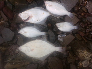 4時過ぎ釣り場に戻り釣り再開です。仕掛けを投入しなおして待つ事数十分・・・・漆黒の闇の静寂を引き裂くかのような「ジッジー」と短いドラグ音が一鳴き(@_@;)しかし、同じようなリールが3台あるためどれが鳴いたか探すのに一苦労(>_<)見ていると僕のスッピンの穂先がユラユラ♪深夜という事もあり無声で合わせ!久々の重量感♪石カレイ30cm切るくらいでした。