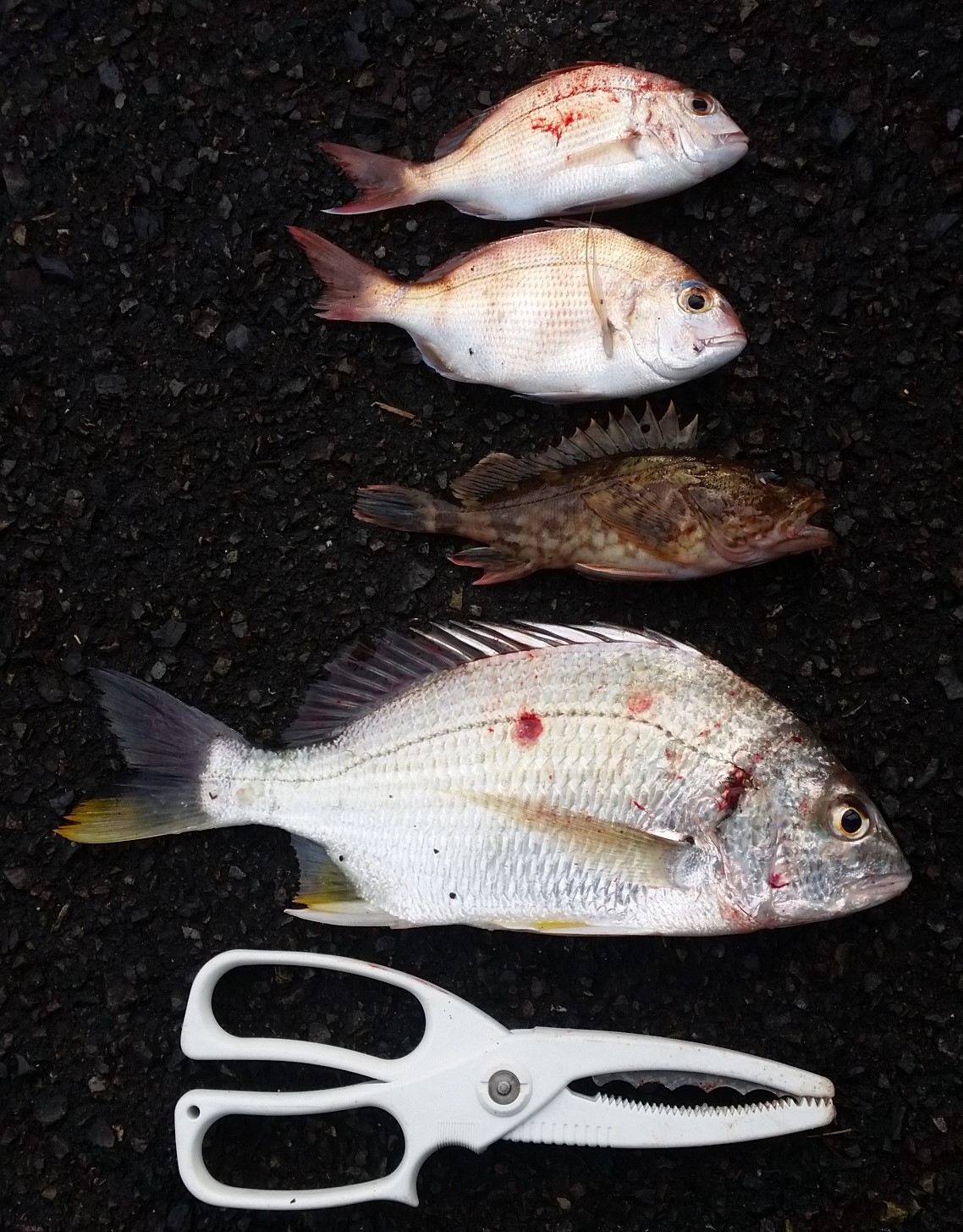 当たりもないのでそそくさと道具を片付けて、子供お付き合いで投げ釣りをして釣れた獲物はキューセン(小)・イソベラ(小)・おじさん(極小)大物はタカノハダイ!でも美味しそうではなかったので戦力外通告をして帰宅してもらいました(笑)