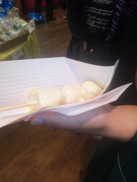 甘~~い苺を串に刺してホワイトチョコレートをコーティングしてあります。