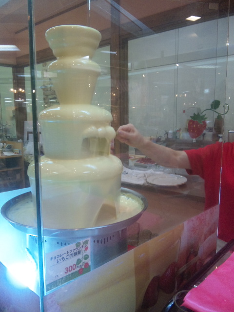 高さ推定12mくらいの機会最上段から温かいホワイトチョコレートがナイアガラの滝のように流れています。