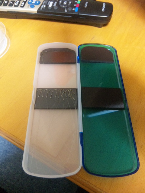 ケース本体はハードタイプの筆箱で、針をスポンジで止めるかな?